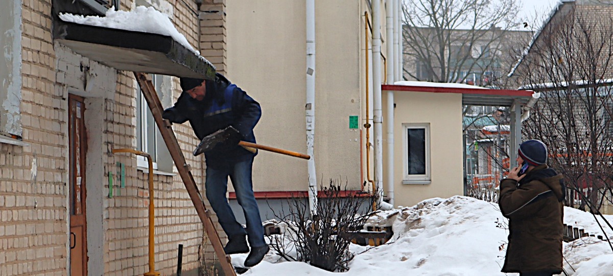 Они осмотрели место происшествия, затем вернулись, разбили упавшую плиту на части и вывезли обломки. После этого двое рабочих под руководством мастера начали очищать от льда и снега козырьки второго и третьего подъездов.