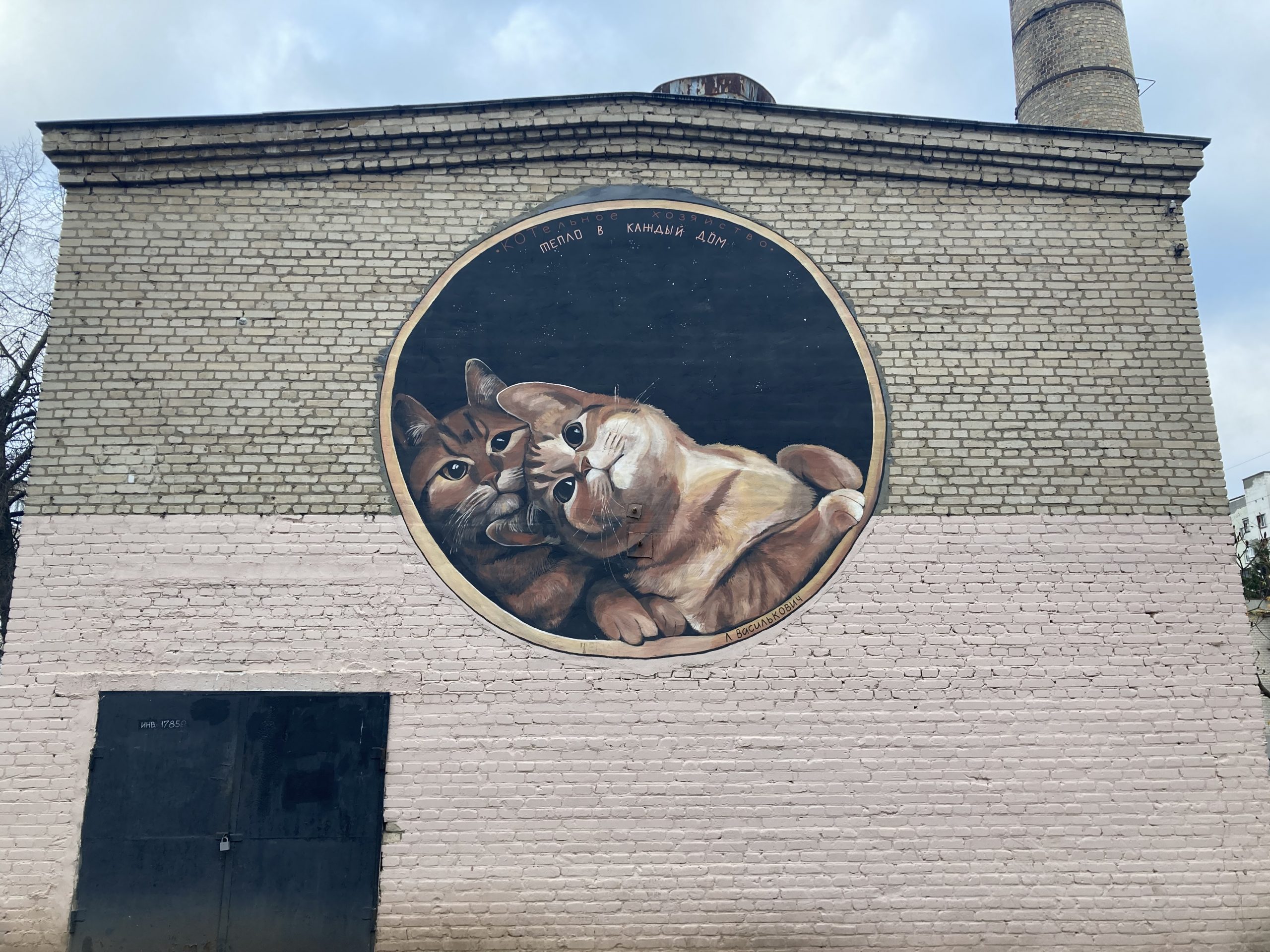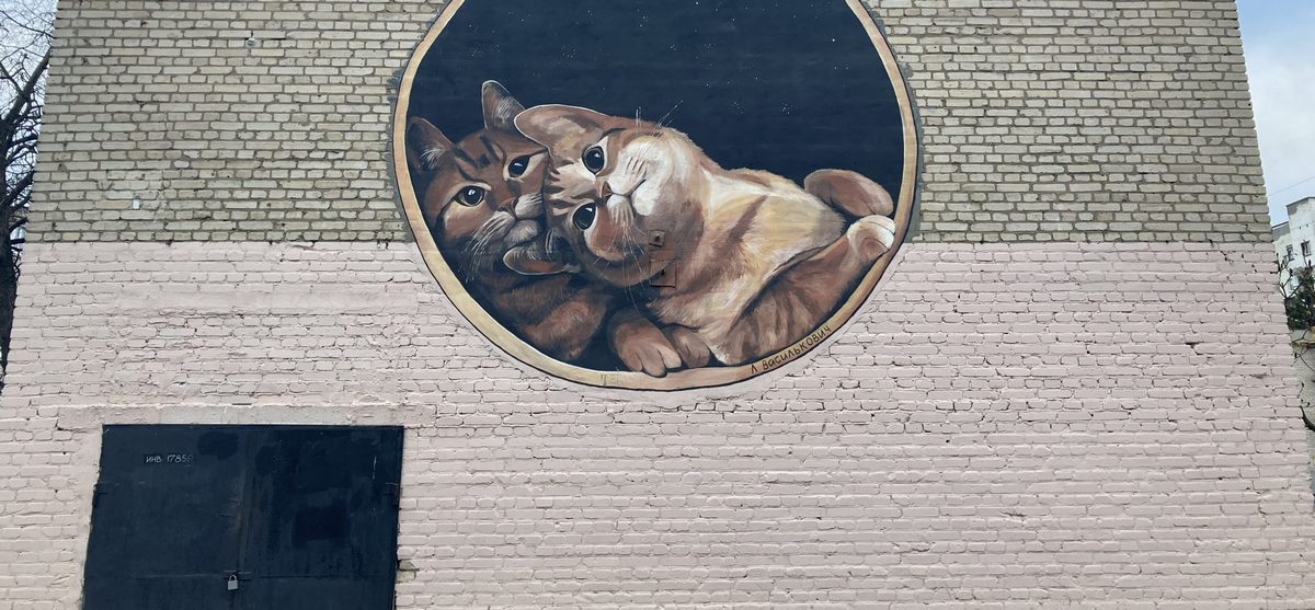 Это еще одна работа Лени Василькович. На ней изображены милейшие коты — то, что нужно для отличных фото. Найти этот стритарт можно во дворе за магазином “Хлебосолье”, который находится на остановке “Гоголя”.