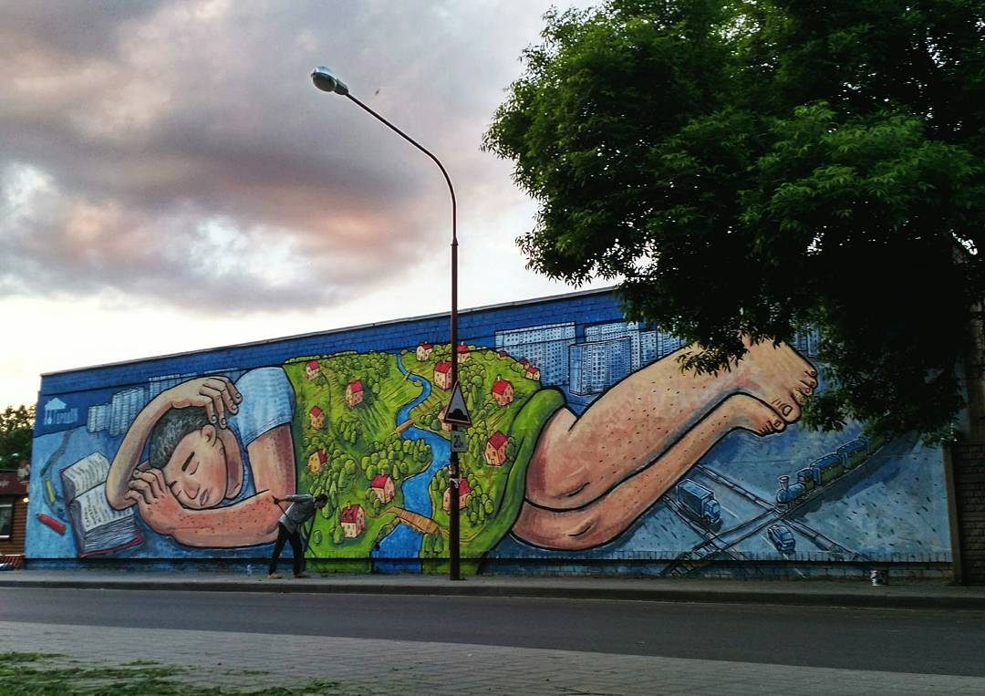 Этот мурал находится на Граевке. Создал его Предок — художник из Витебска по имени Максим. Эта стена принадлежит кафе “Городок”. Изначально хозяева хотели нарисовать кафе, но с пониманием отнеслись к “хотелкам” художника и дали ему карт-бланш на творчество.