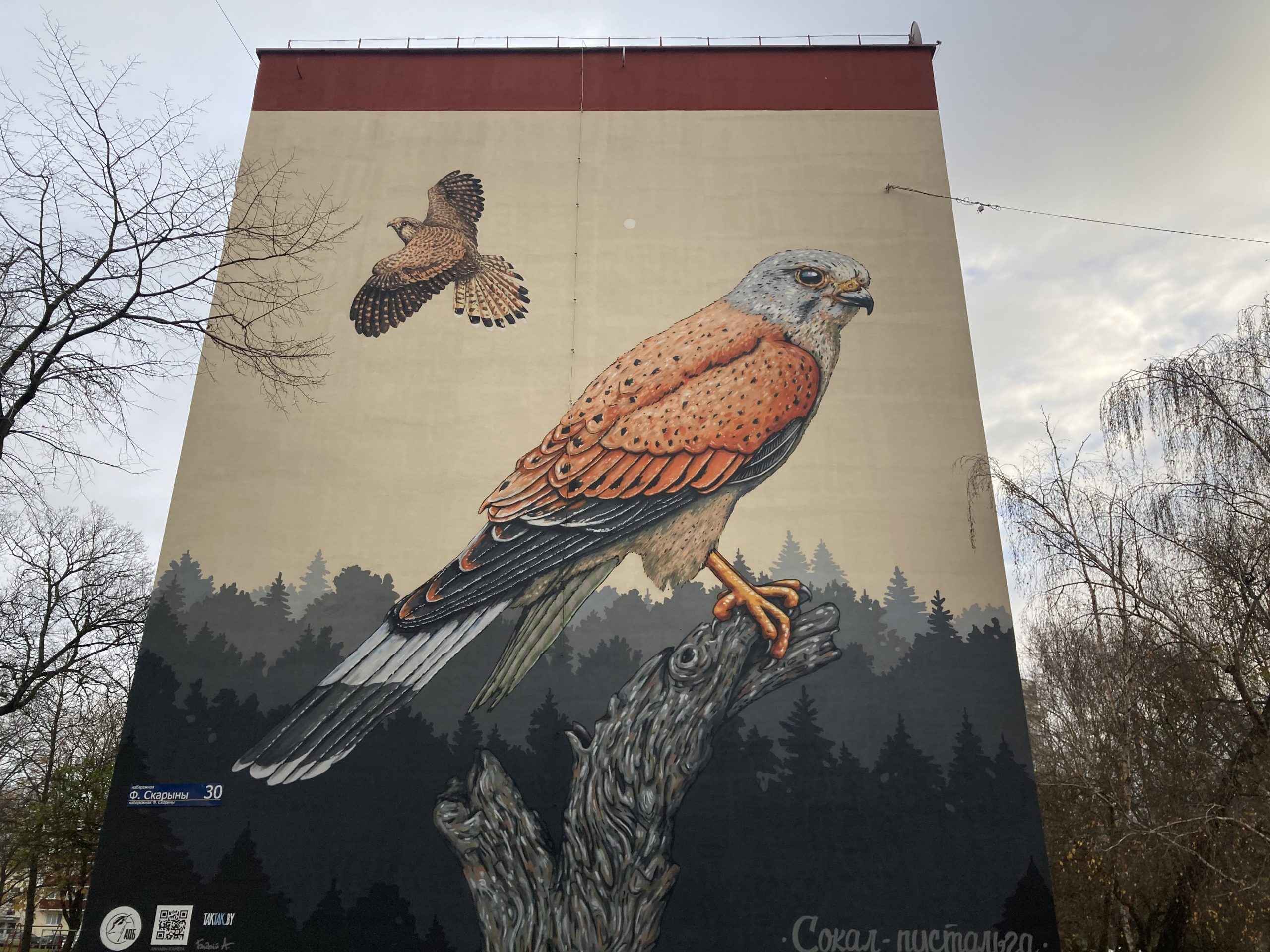 Этот мурал появился чуть больше недели назад и уже стал популярным. Инициаторы его создания — Брестское областное отделение “Аховы птушак Бацькаўшчыны”. Мурал задумали еще полтора года назад, тогда и начали сбор средств на него. Нарисовал эту красоту художник Александр Благий.