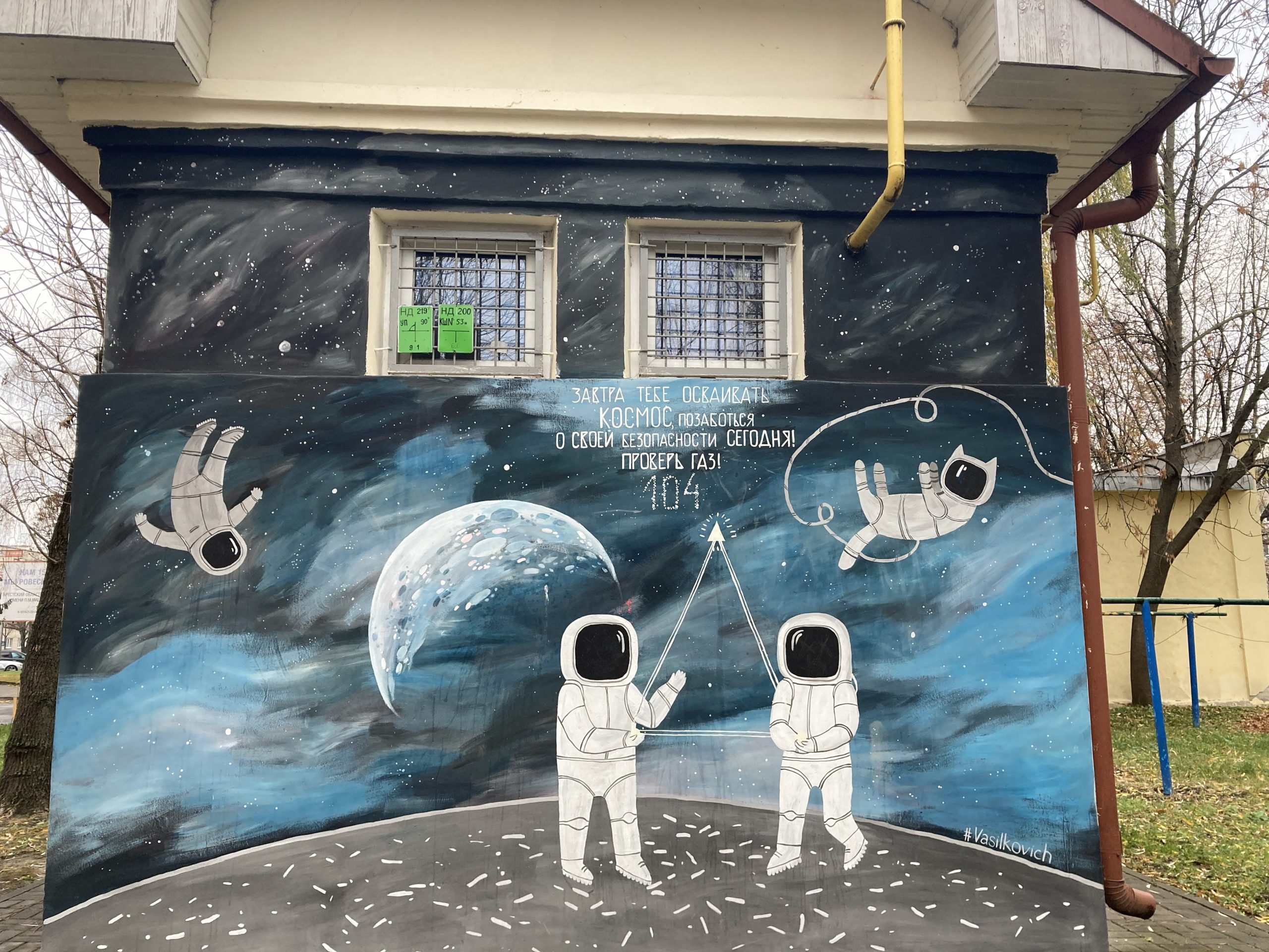 Этот стритарт нарисовала брестская художница Леня Василькович. Находится он в одном из дворов на бульваре Космонавтов. Посвящена работа безопасному отношению с газом, надпись соответствующая: “Завтра тебе осваивать космос, позаботься о своей безопасности сегодня”.