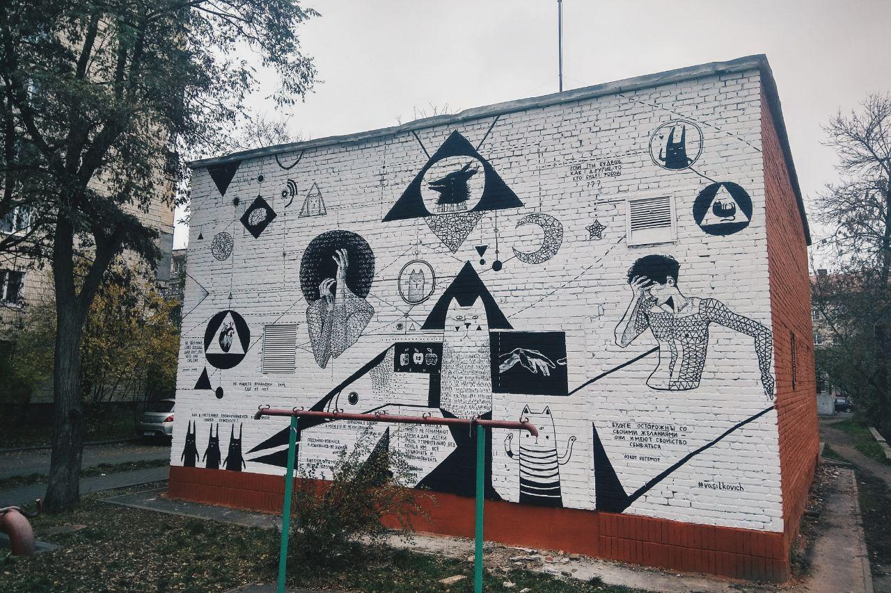 И еще один стритарт от Лени Василькович. Его найдете за остановкой “Университет” на углу Пушкинской и бульвара Космонавтов. Эта работа — настоящий артефакт для людей с чувством юмора. Кроме рисунков здесь можно прочитать увлекательные и смешные афоризмы.