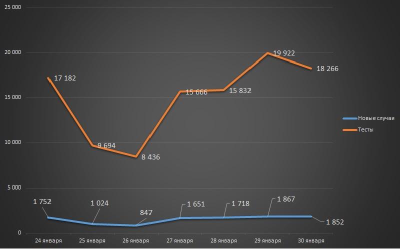 Наибольшее число зараженных было выявлено в пятницу – 1 867 новых случаев. Наименьшее – во вторник (847). Кстати, это был единственный день в январе, когда количество новых случаев не превысило 1 000. В среднем ежедневный прирост составил 1 530 случаев. Это меньше, чем неделей ранее. Тогда этот показатель составил в среднем 1 760 новых случаев коронавирусной инфекции в сутки.