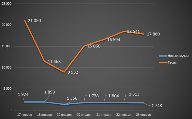 Продолжая следить за ковидными показателями в недельном цикле, можно сделать вывод о том, что заболеваемость, по официальной статистике, снижается: если с 10 по 16 января (напомним, мы выбрали диапазон с воскресенья по субботу) в стране было выявлено 13 169 инфицированных, то за период с 17 по 23 января – на 847 случаев меньше (12 322).