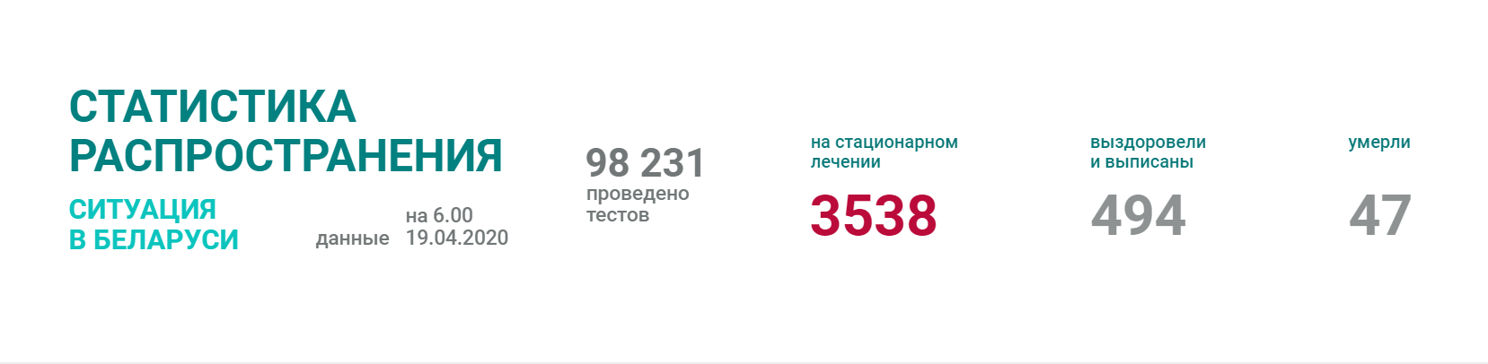 С понедельника 13 апреля по воскресенье 19 апреля количество умерших, у которых был подтвержден коронавирус, увеличилось в Беларуси с 29 до 47 человек. А вот сколько в стране заболевших, уже несколько суток остается загадкой: последний раз общую цифру выявленных случаев коронавирусной инфекции Минздрав озвучивал 17 апреля – тогда сообщалось, что COVID-19 подтвержден у 4 779 человек. По данным на 19 апреля, в Беларуси выздоровели и выписаны 494 пациента, на стационарном лечении находились 3 538 человек. Остальные – на амбулаторном лечении или выписаны после прохождения лечения. Сколько всего выявлено случаев – секрет.