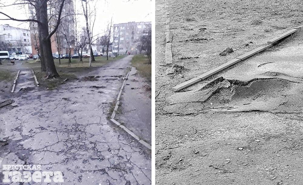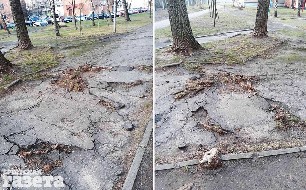 Корреспондент «БГ» отправилась на место и убедилась в правоте слов читателя. Действительно, корни растущих рядом с пешеходными дорожками деревьев поднимают асфальтовое покрытие. Оно во многих местах потрескалось, а в некоторых — толстые корни деревьев «разрезали» его на мелкие части.