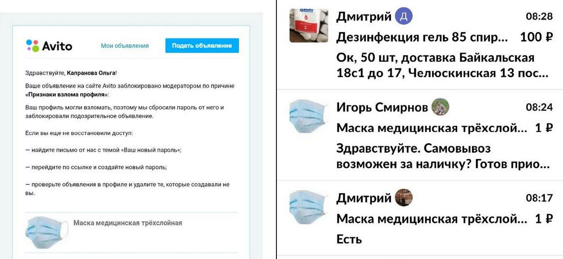 Тем не менее, уверяет Ольга, в московских аптеках защитных масок нет. И это при том, что в городе с таковыми редко можно кого-то встретить. Как и в Беларуси, на фоне распространения коронавируса вокруг них сложился ажиотаж. Дошло до того, что взломали аккаунт женщины на торговой онлайн-площадке  и от ее имени торговали средствами защиты – масками и антисептиками.