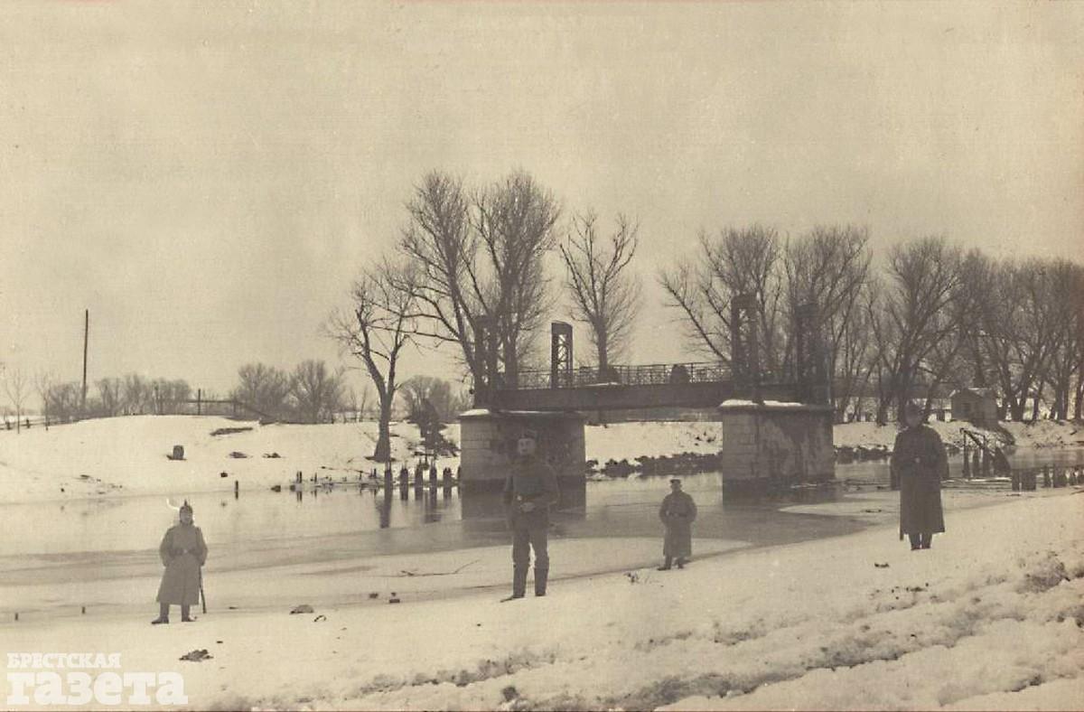 Мост из металла и бетона через правый рукав реки Мухавец, соединявший цитадель с Кобринским укреплением. 1915 год.