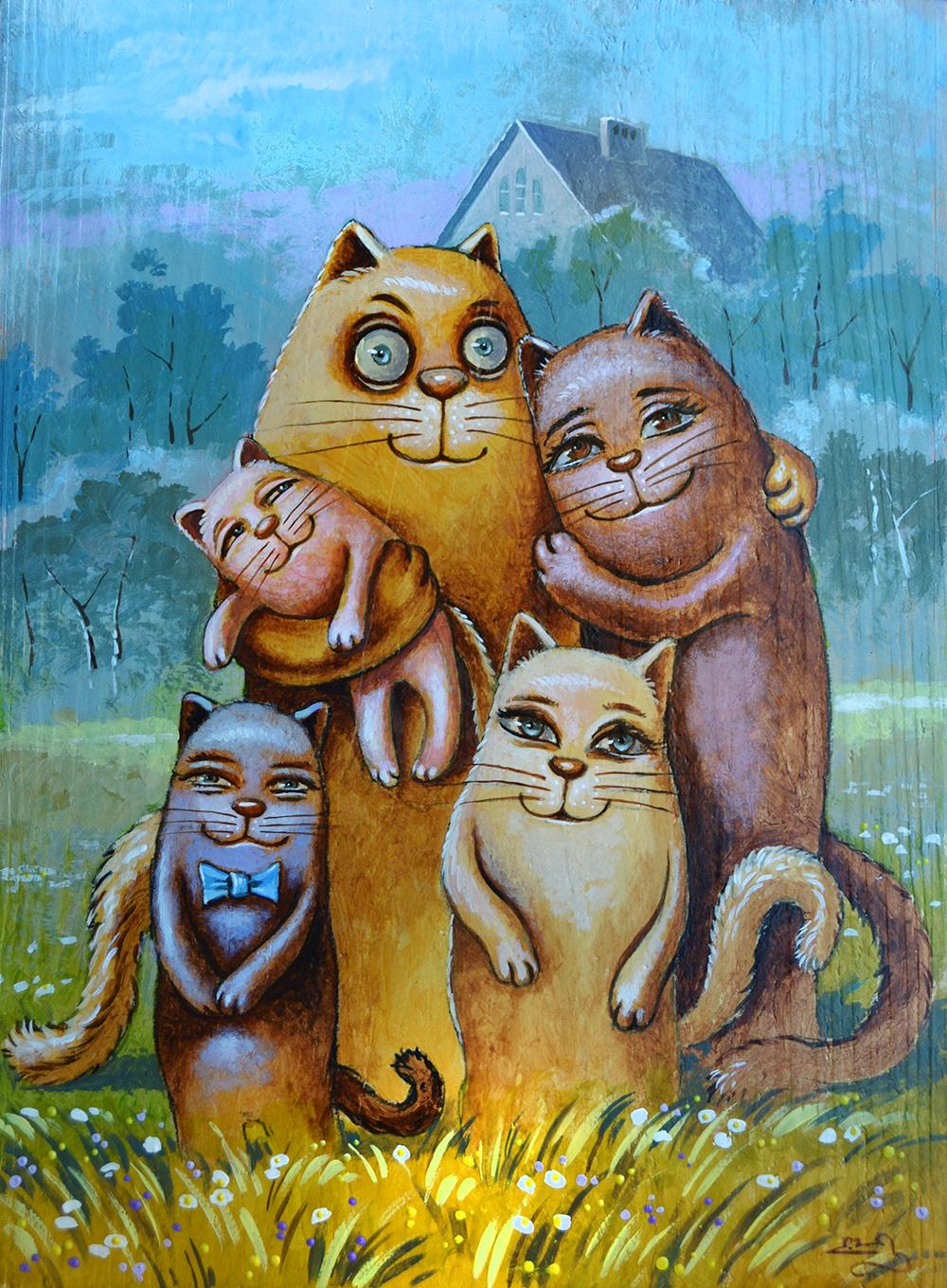 Довольно часто Павлу заказывают портреты в виде котов. Порой целыми семьями. Кто-то, глядя на его работы, назвал это «котописью», а художника – «котописцем». Иногда коллеги, тоже рисующие котиков, пишут ему с вопросами в стиле: «Котописец котописца спрашивает…» или «Главный брестский котописец не может не знать…».