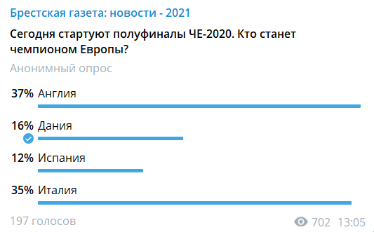 В голосовании участвовало 197 человек. 72 голоса (37%) было отдано за сборную Англии, 70 голосов (35%) – за Италию. За двух других участников полуфинальной стадии проголосовало гораздо меньше читателей «БГ». Победу Дании прочат 32 человека (16%), а Испании – 23 (12%).